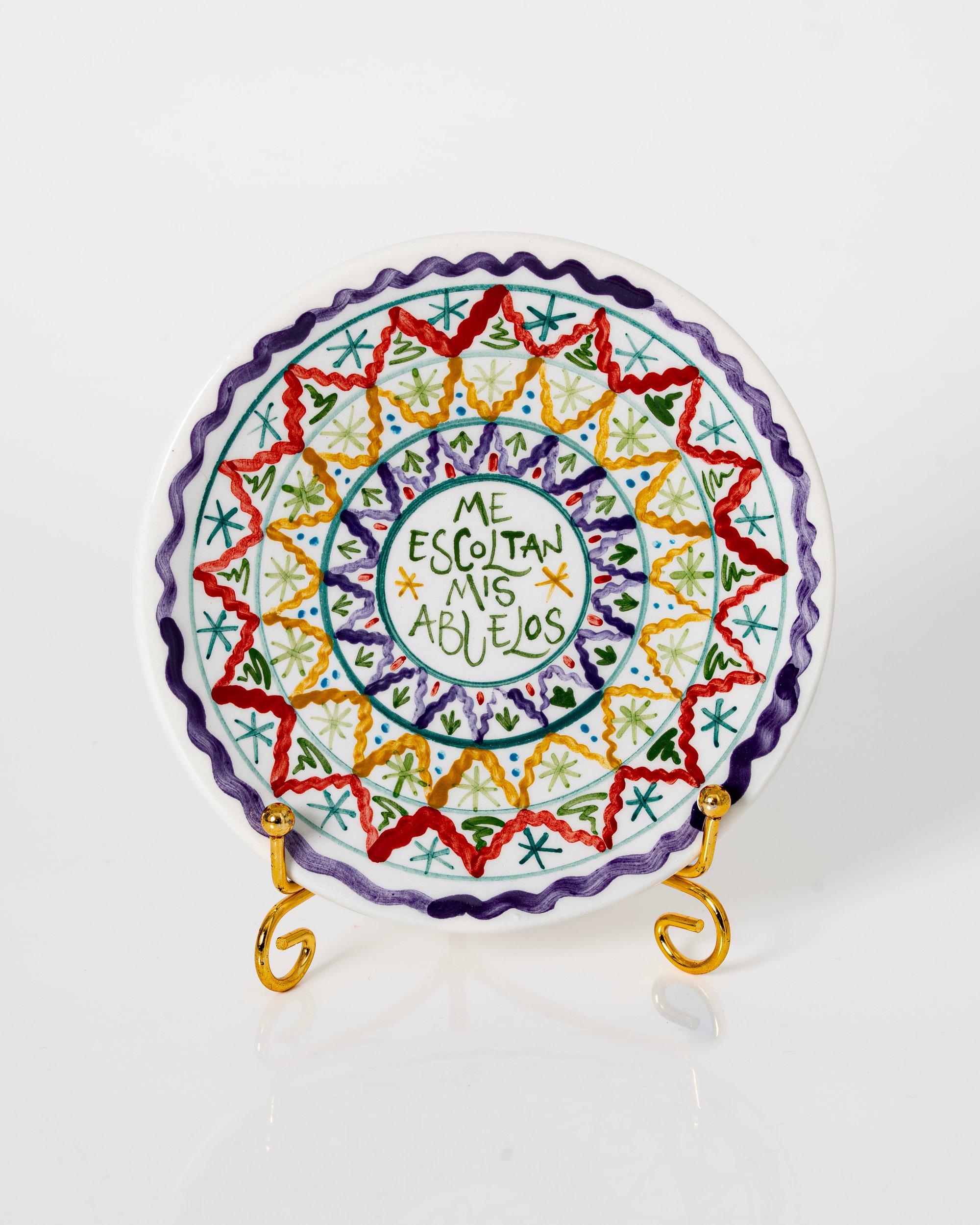 Cada plato puede llevar dos agujeros por detrás. Algunos, por el proceso de esmaltado y horneado, pueden ser taponados. Tanto si es el caso como si no, se recomienda colgar con un soporte abrazadera o colocar sobre un soporte de pie como en la imagen de presentación. Las piezas son esmaltadas sólo por la cara decorada.