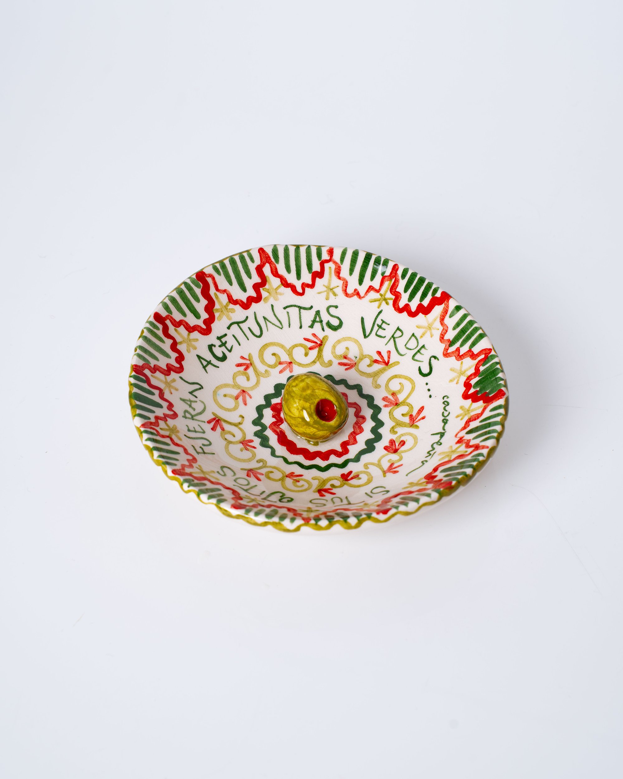 Plato mini artesanal con aceituna decorativa en relieve. Acabado con filo irregular y textura por la cara trasera.