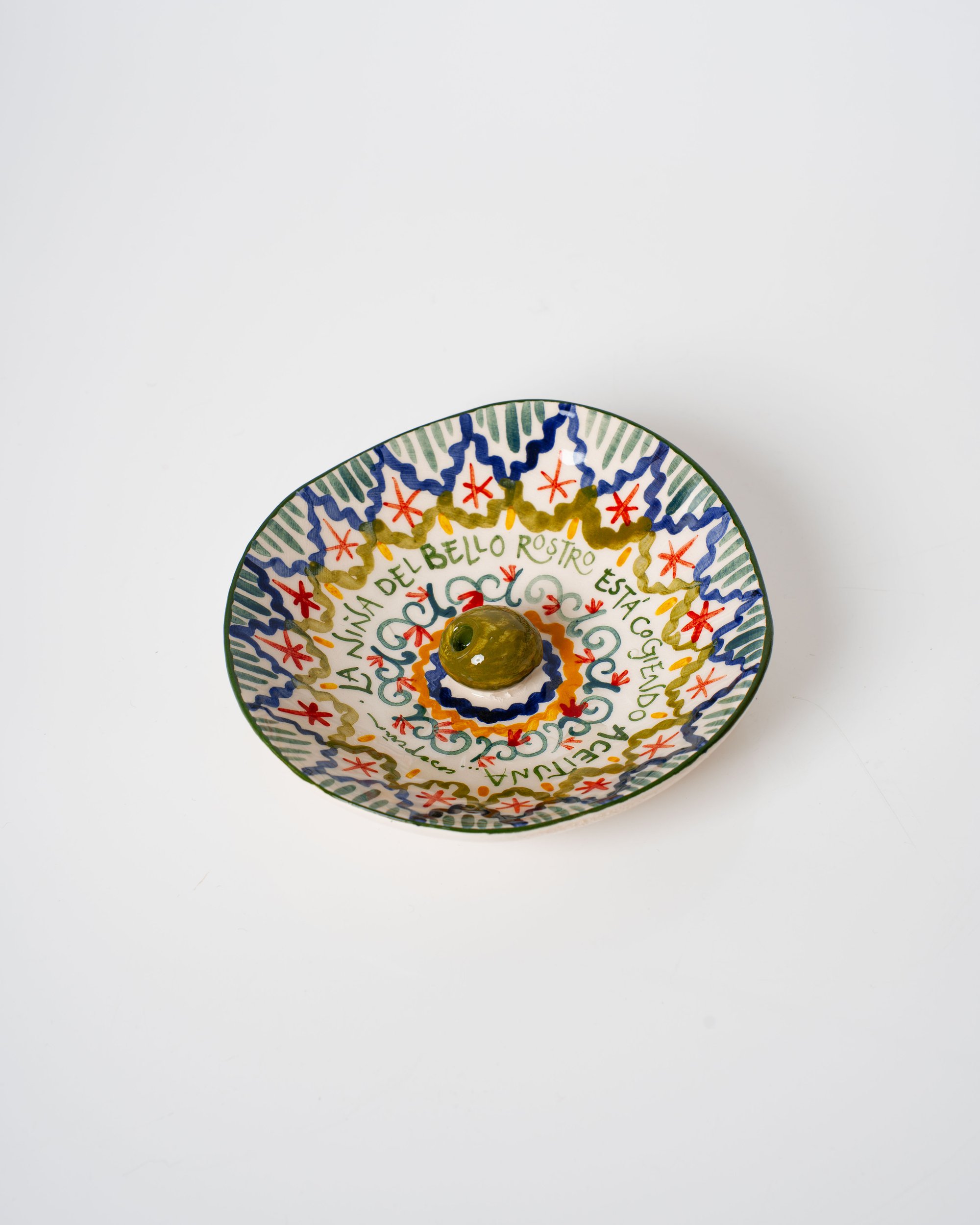 Plato mini artesanal con aceituna decorativa en relieve. Acabado con filo irregular y textura por la cara trasera.