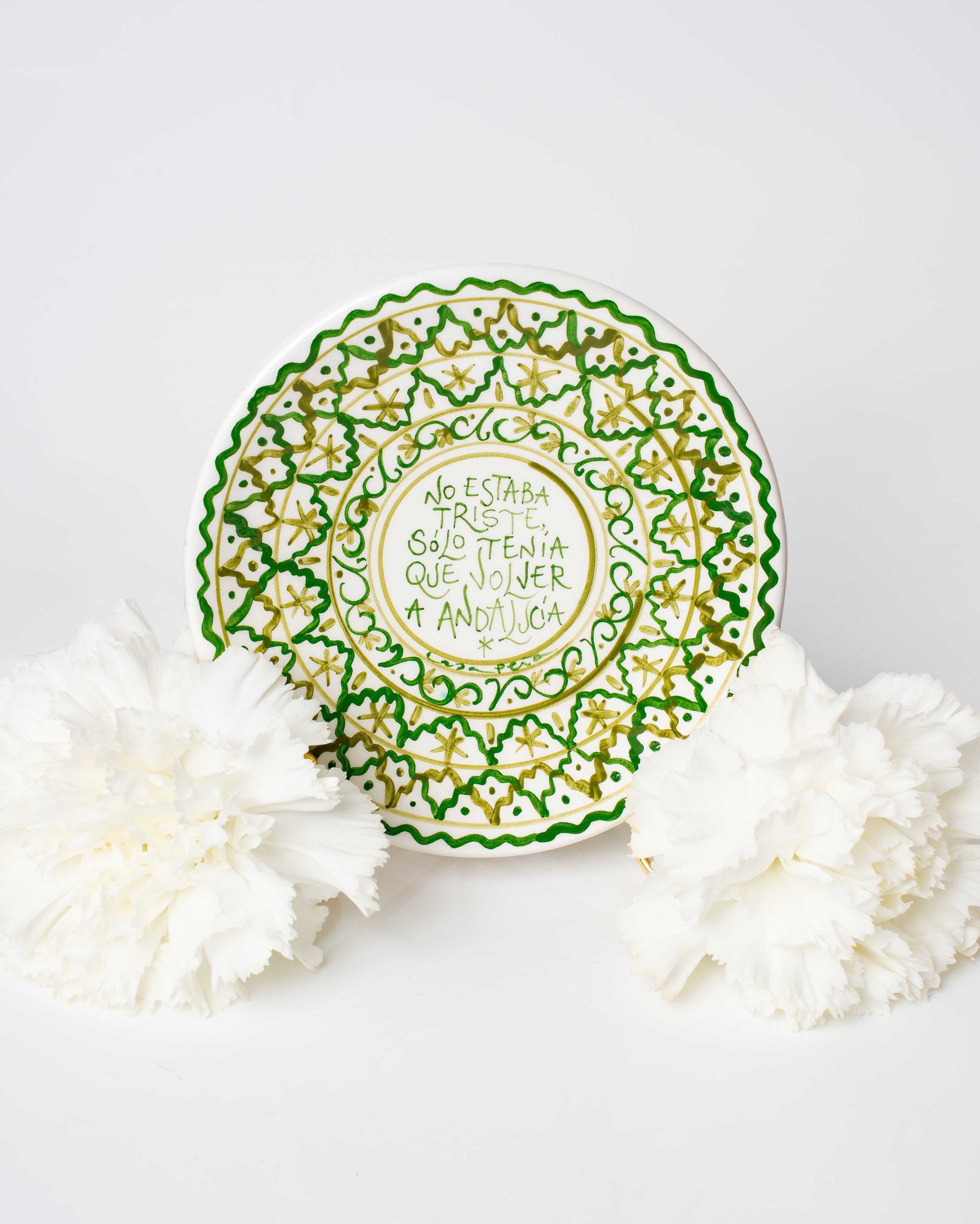 Cada plato puede llevar dos agujeros por detrás. Algunos, por el proceso de esmaltado y horneado, pueden ser taponados. Tanto si es el caso como si no, se recomienda colgar con un soporte abrazadera o colocar sobre un soporte de pie como en la imagen de presentación. Las piezas son esmaltadas sólo por la cara decorada.