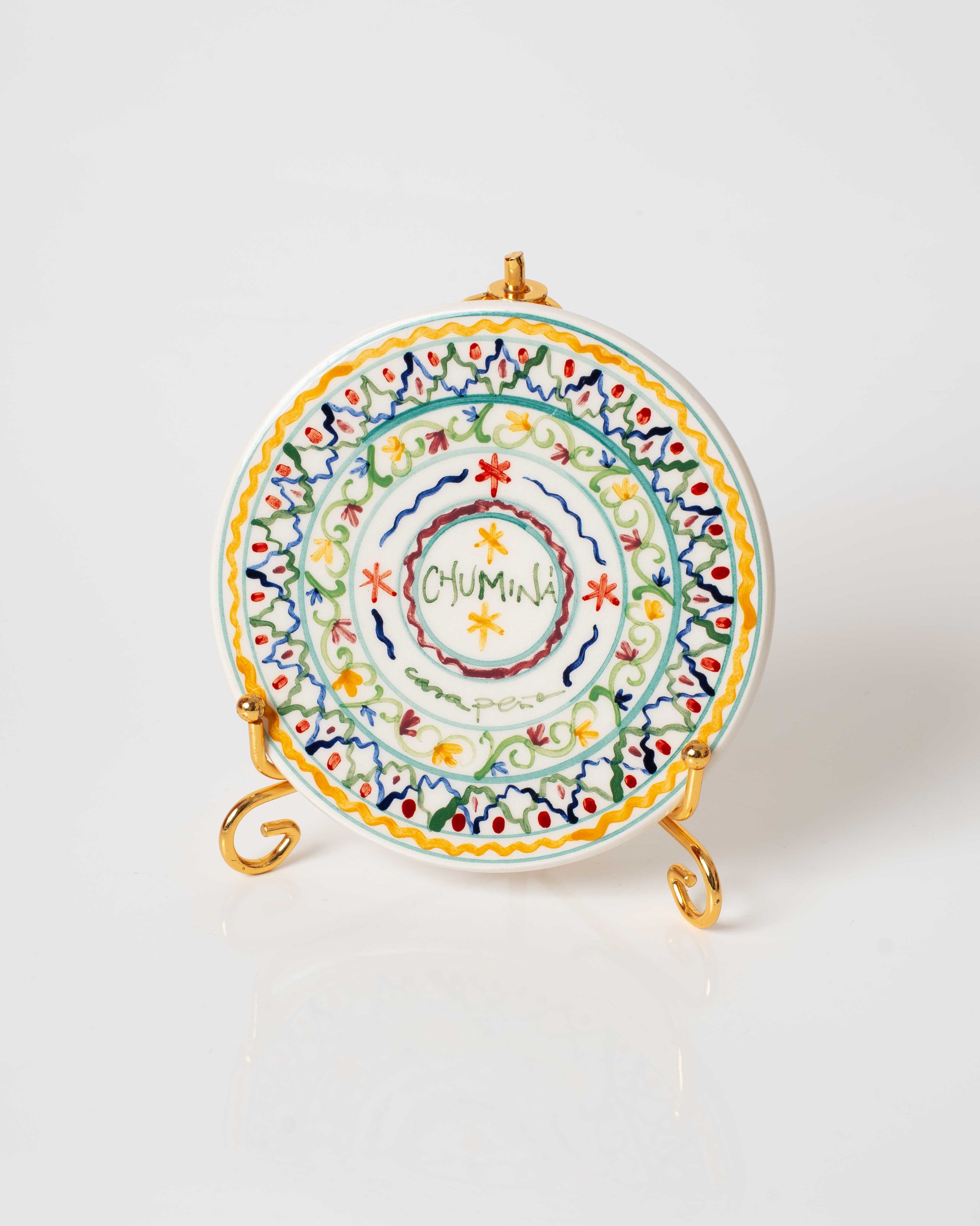 Cada plato puede llevar dos agujeros por detrás. Algunos, por el proceso de esmaltado y horneado, pueden ser taponados. Tanto si es el caso como si no, se recomienda colgar con un soporte abrazadera o colocar sobre un soporte de pie como en la imagen de presentación. Las piezas son esmaltadas sólo por la cara decorada.