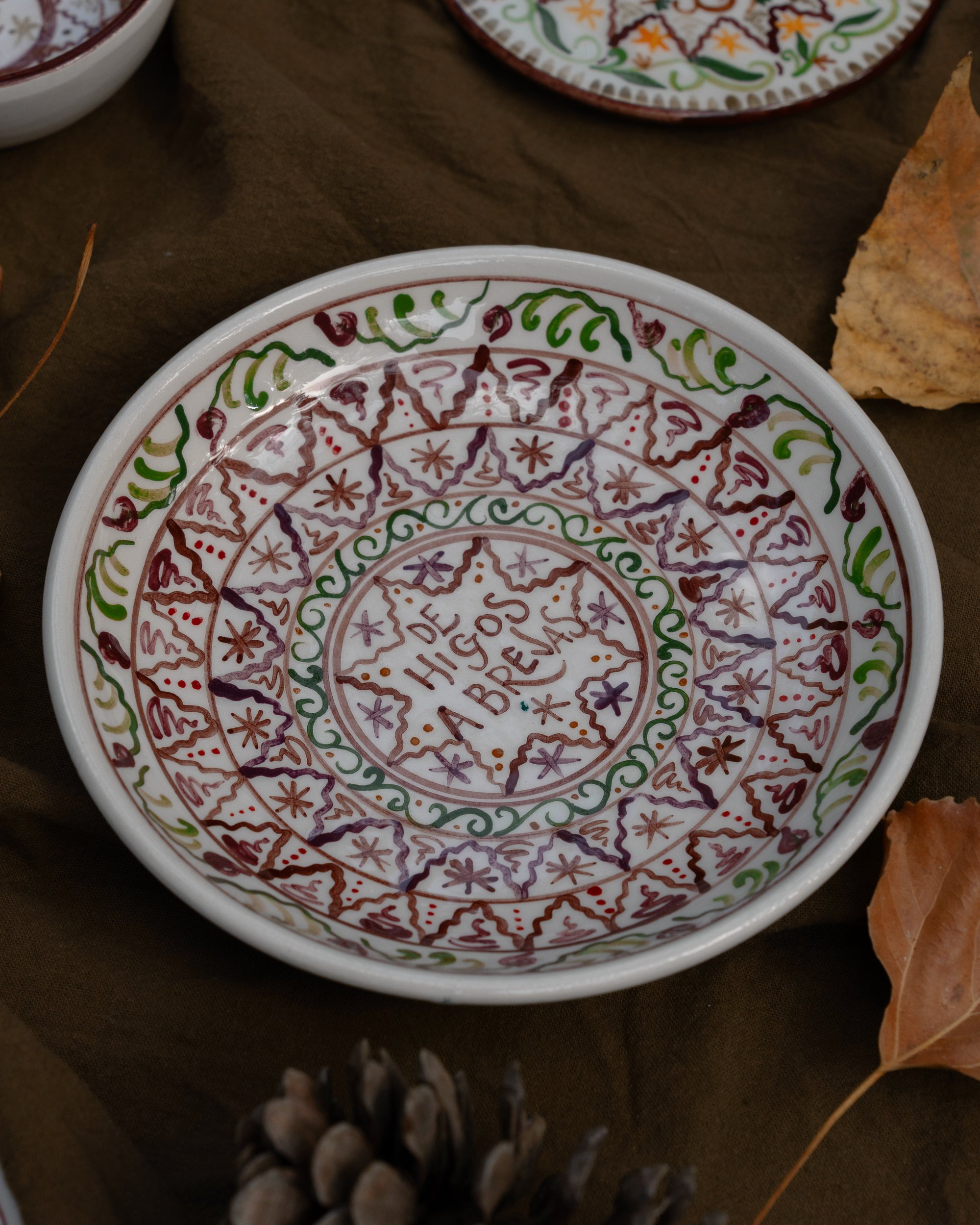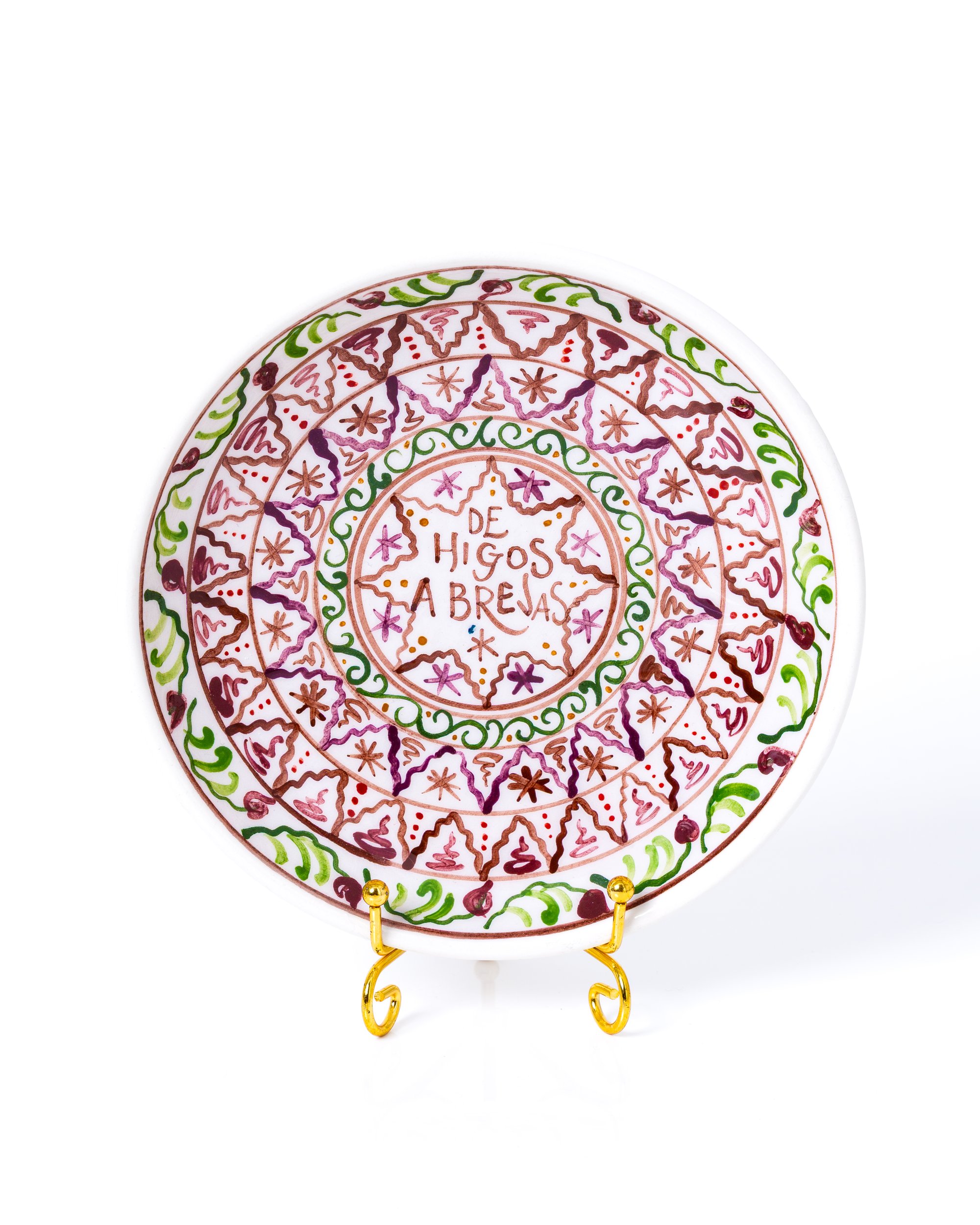 Cada plato puede llevar dos agujeros por detrás. Algunos, por el proceso de esmaltado y horneado, pueden ser taponados. Tanto si es el caso como si no, se recomienda colgar con un soporte abrazadera o colocar sobre un soporte de pie como en la imagen de presentación. Las piezas son esmaltadas sólo por la cara decorada.