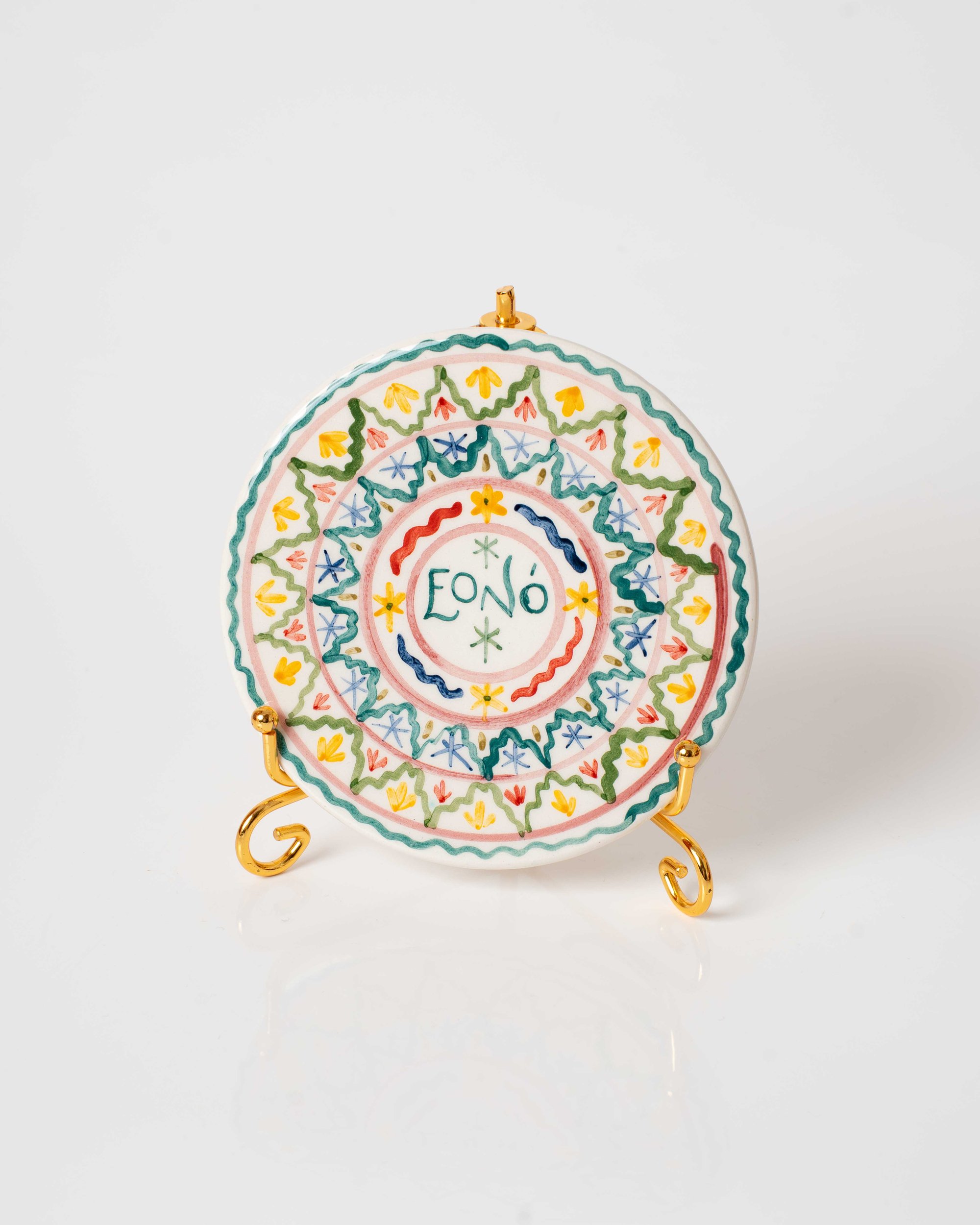 Cada plato puede llevar dos agujeros por detrás. Algunos, por el proceso de esmaltado y horneado, pueden ser taponados. Tanto si es el caso como si no, se recomienda colgar con un soporte abrazadera o colocar sobre un soporte de pie como en la imagen de presentación. Las piezas son esmaltadas sólo por la cara decorada.