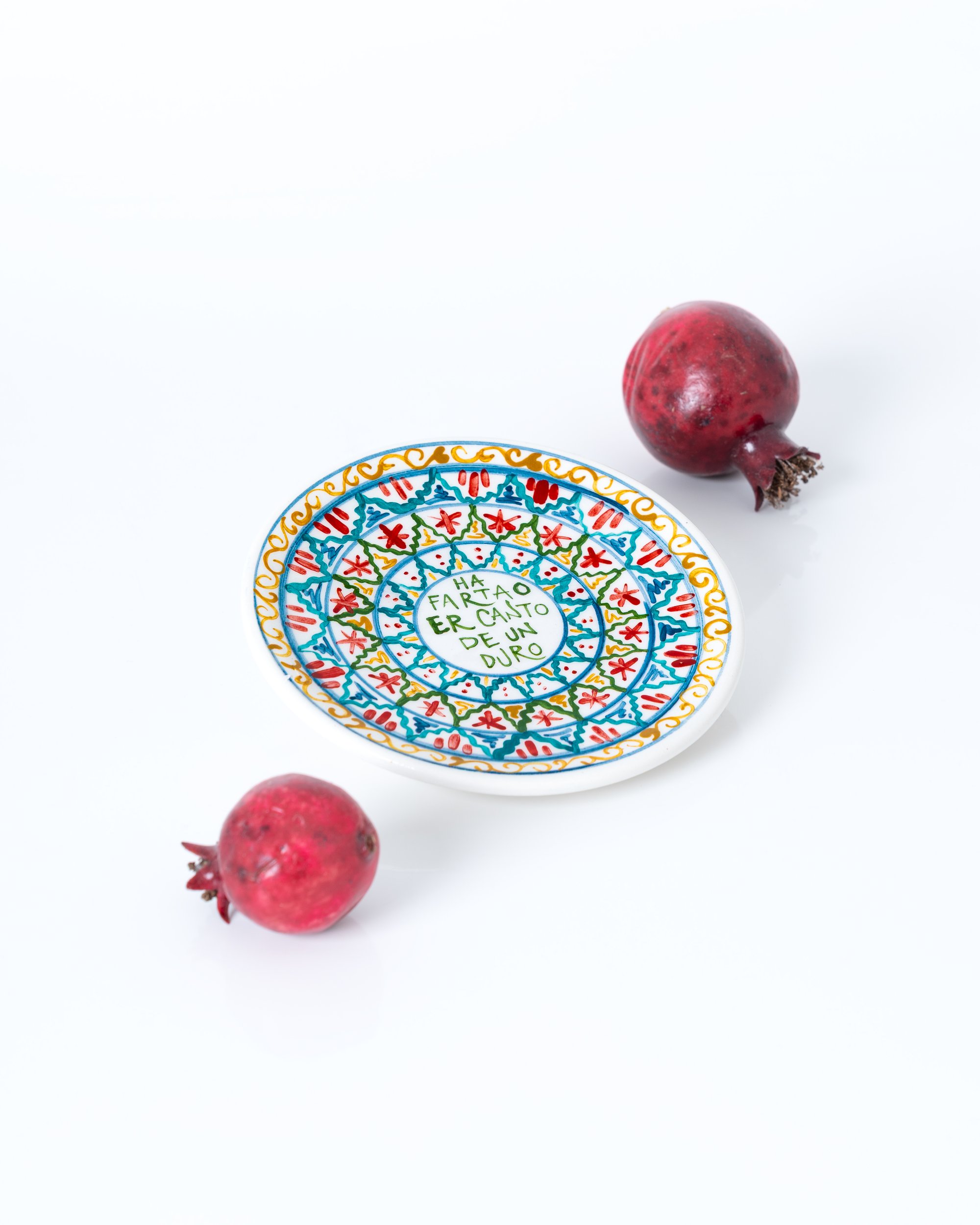 Esta pieza está destinada exclusivamente a fines decorativos. No está diseñada ni certificada para el contacto con alimentos. No calentar en microondas. Lavar a mano y secar tras su uso. Evitar los choques térmicos.