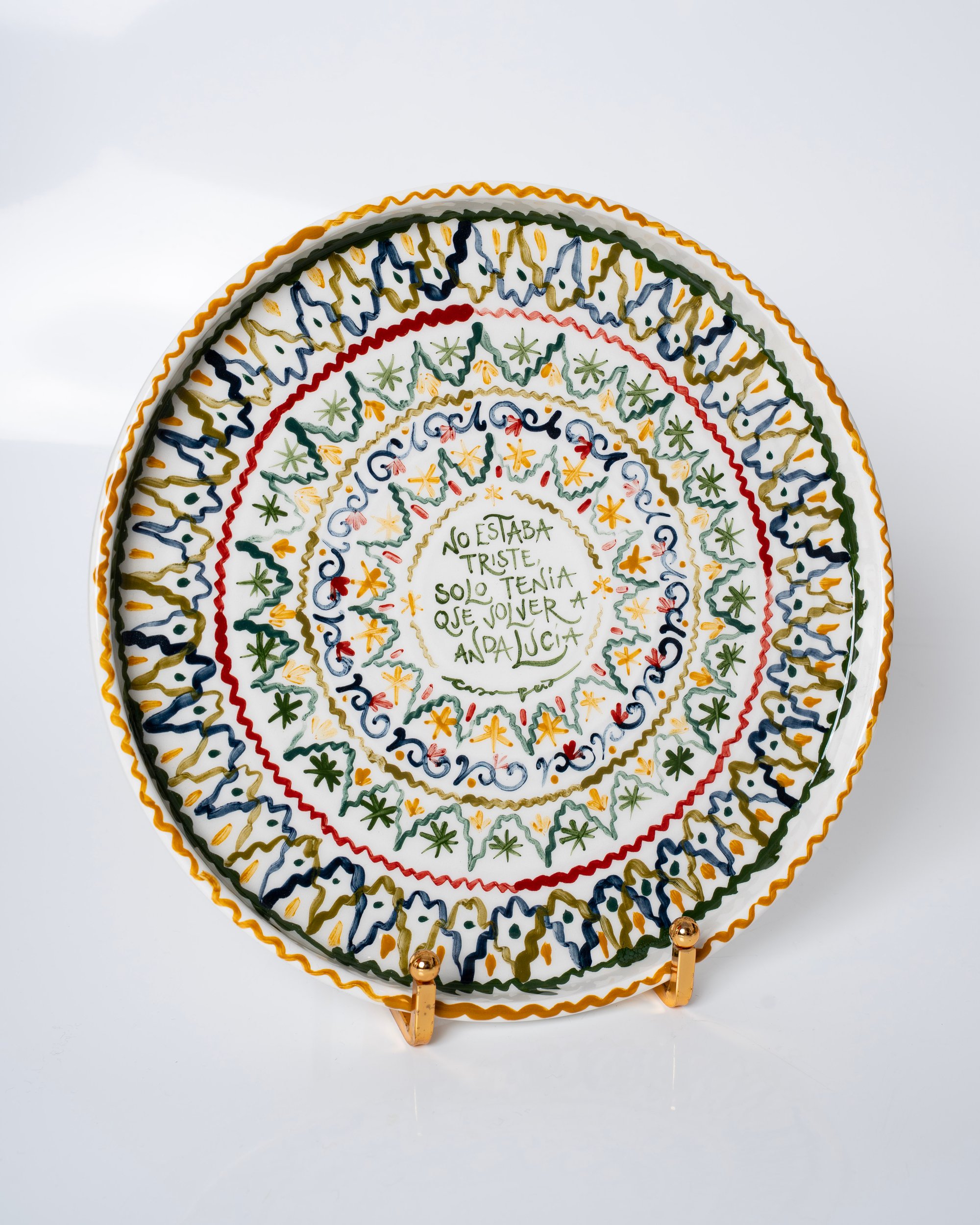 Cada plato puede llevar dos agujeros por detrás. Algunos, por el proceso de esmaltado y horneado, pueden ser taponados. Tanto si es el caso como si no, se recomienda colgar con un soporte abrazadera o colocar sobre un soporte de pie como en la imagen de presentación. Las piezas son esmaltadas sólo por la cara decorada.