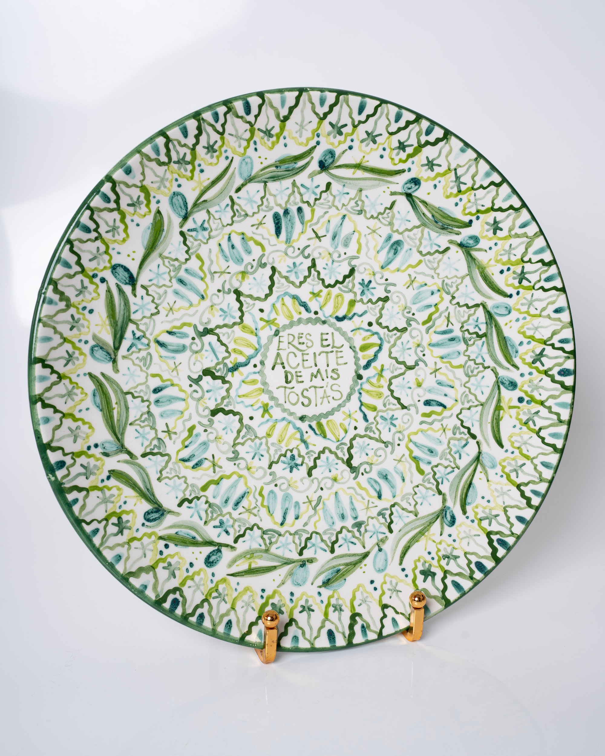 Cada plato puede llevar dos agujeros por detrás. Algunos, por el proceso de esmaltado y horneado, pueden ser taponados. Tanto si es el caso como si no, se recomienda colgar con un soporte abrazadera o colocar sobre un soporte de pie como en la imagen de presentación. Las piezas son esmaltadas sólo por la cara decorada.