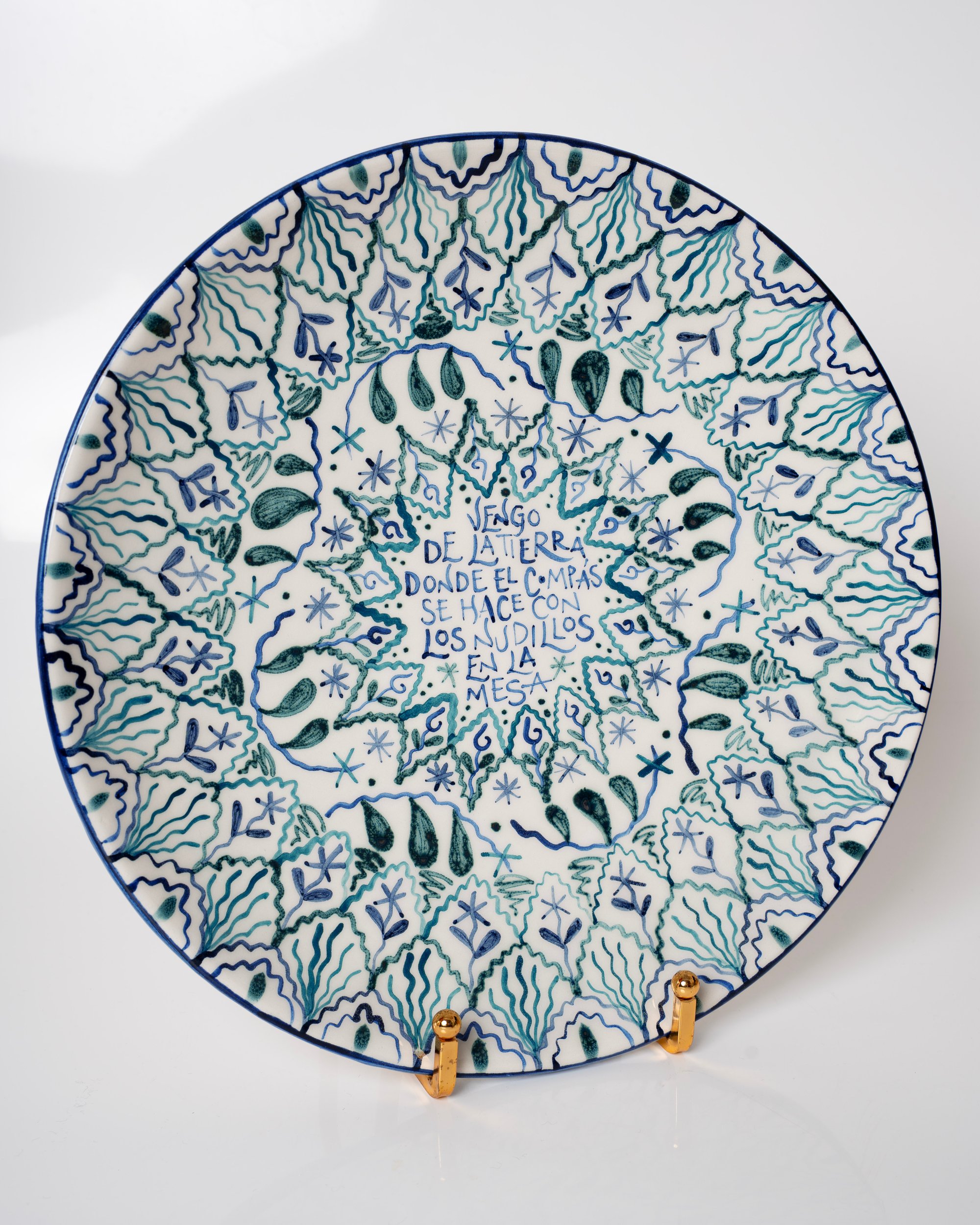 Cada plato puede llevar dos agujeros por detrás. Algunos, por el proceso de esmaltado y horneado, pueden ser taponados. Tanto si es el caso como si no, se recomienda colgar con un soporte abrazadera o colocar sobre un soporte de pie como en la imagen de presentación. Las piezas son esmaltadas sólo por la cara decorada.