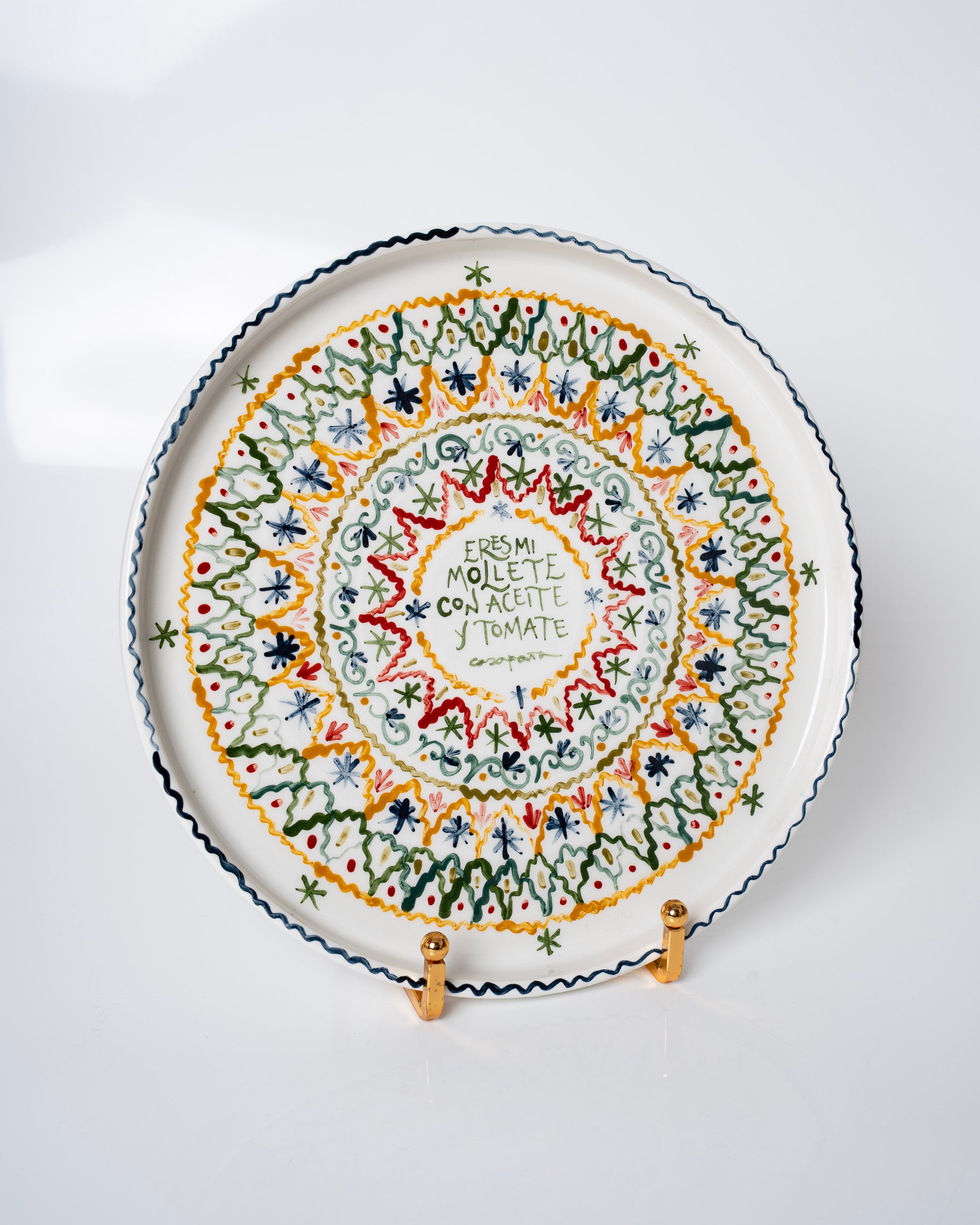Cada plato puede llevar dos agujeros por detrás. Algunos, por el proceso de esmaltado y horneado, pueden ser taponados. Tanto si es el caso como si no, se recomienda colgar con un soporte abrazadera o colocar sobre un soporte de pie como en la imagen de presentación. Las piezas son esmaltadas sólo por la cara decorada.