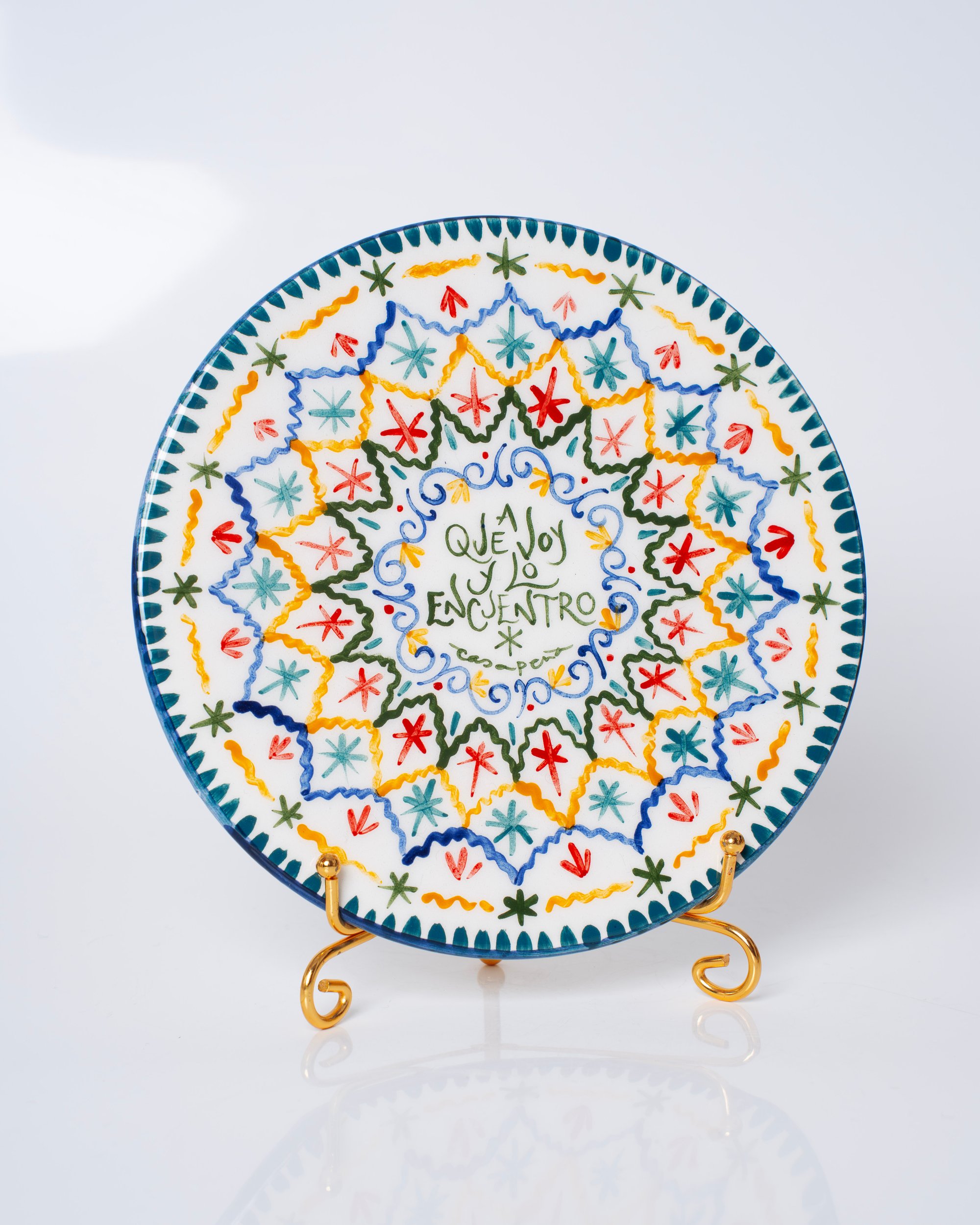Cada plato puede llevar dos agujeros por detrás. Algunos, por el proceso de esmaltado y horneado, pueden ser taponados. Tanto si es el caso como si no, se recomienda colgar con un soporte abrazadera o colocar sobre un soporte de pie como en la imagen de presentación. Las piezas son esmaltadas sólo por la cara decorada.