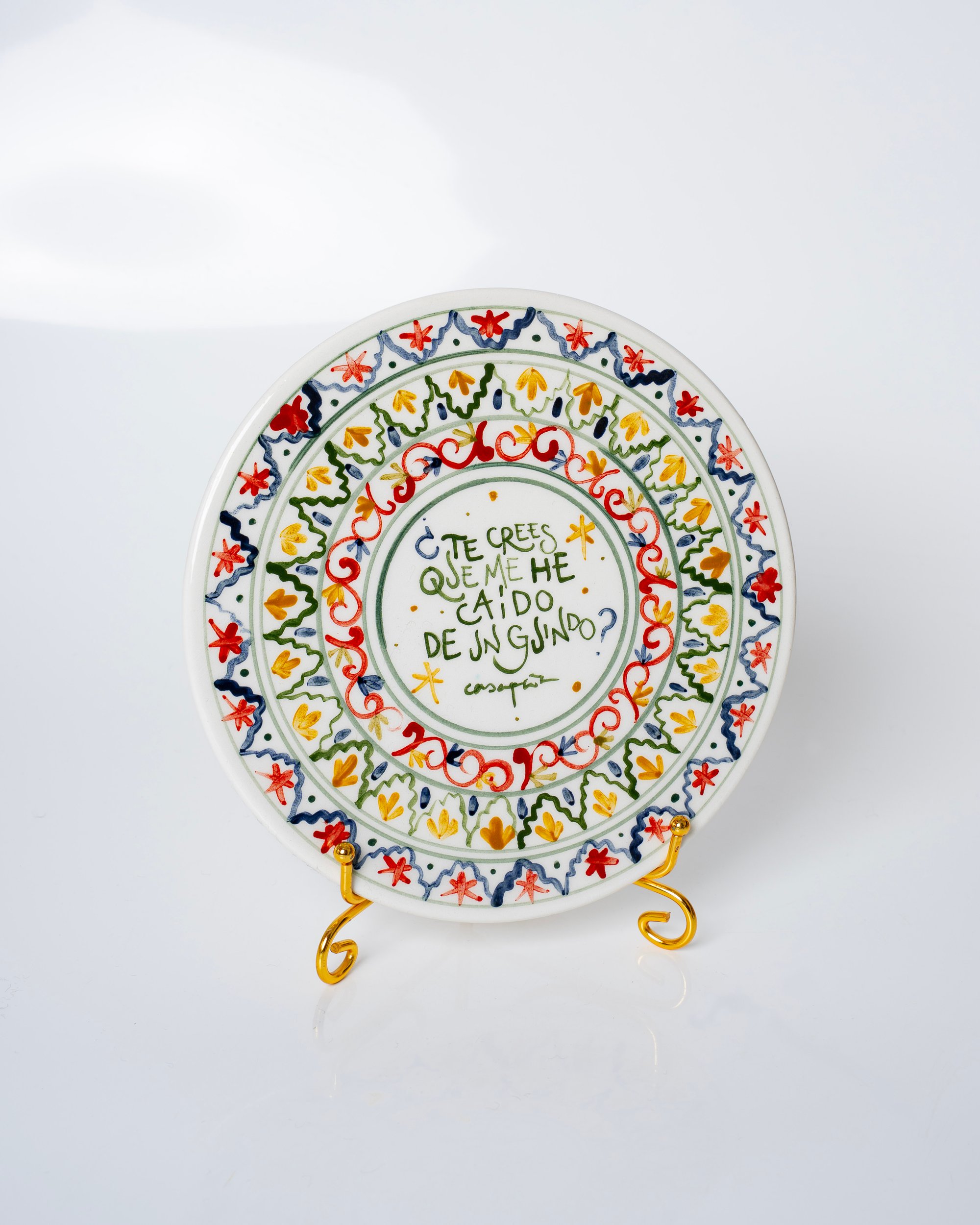 Cada plato puede llevar dos agujeros por detrás. Algunos, por el proceso de esmaltado y horneado, pueden ser taponados. Tanto si es el caso como si no, se recomienda colgar con un soporte abrazadera o colocar sobre un soporte de pie como en la imagen de presentación. Las piezas son esmaltadas sólo por la cara decorada.