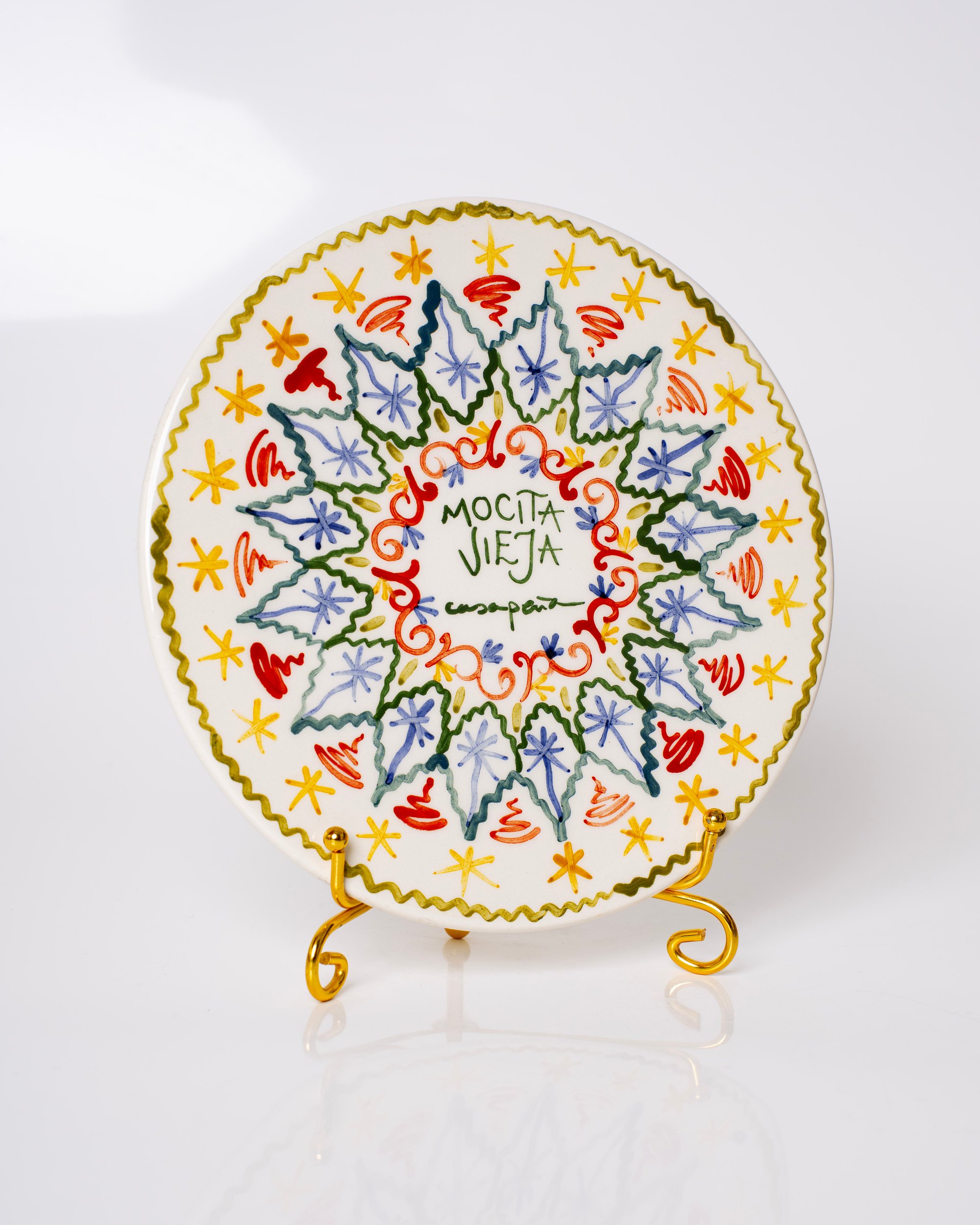Cada plato puede llevar dos agujeros por detrás. Algunos, por el proceso de esmaltado y horneado, pueden ser taponados. Tanto si es el caso como si no, se recomienda colgar con un soporte abrazadera o colocar sobre un soporte de pie como en la imagen de presentación. Las piezas son esmaltadas sólo por la cara decorada.