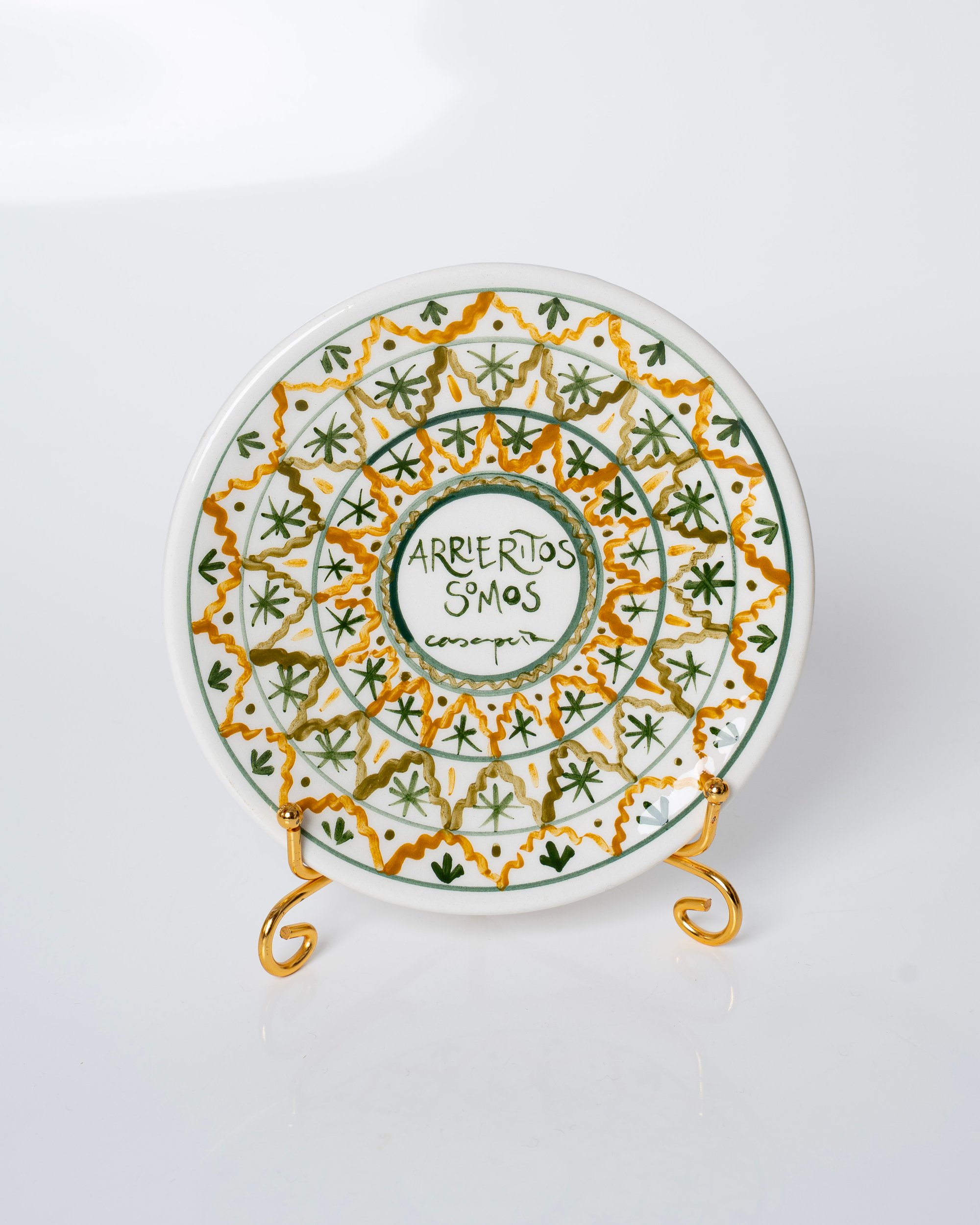 Cada plato puede llevar dos agujeros por detrás. Algunos, por el proceso de esmaltado y horneado, pueden ser taponados. Tanto si es el caso como si no, se recomienda colgar con un soporte abrazadera o colocar sobre un soporte de pie como en la imagen de presentación. Las piezas son esmaltadas sólo por la cara decorada.