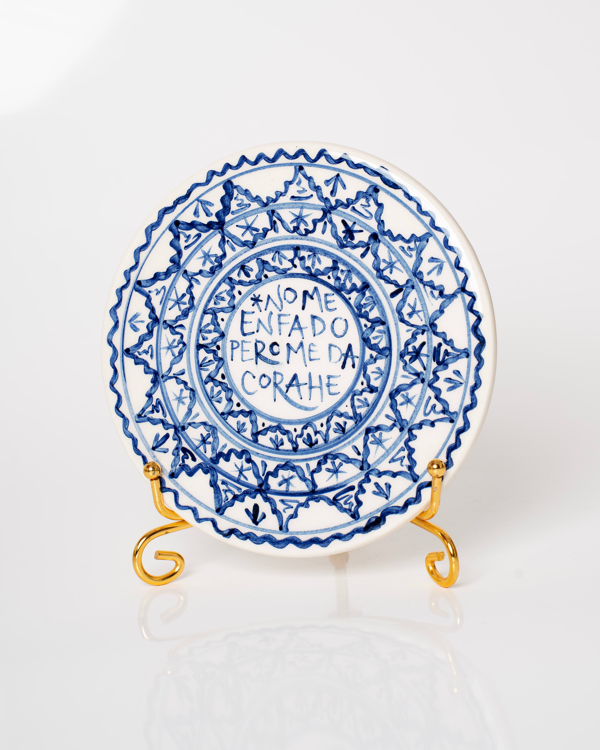Cada plato puede llevar dos agujeros por detrás. Algunos, por el proceso de esmaltado y horneado, pueden ser taponados. Tanto si es el caso como si no, se recomienda colgar con un soporte abrazadera o colocar sobre un soporte de pie como en la imagen de presentación. Las piezas son esmaltadas sólo por la cara decorada.