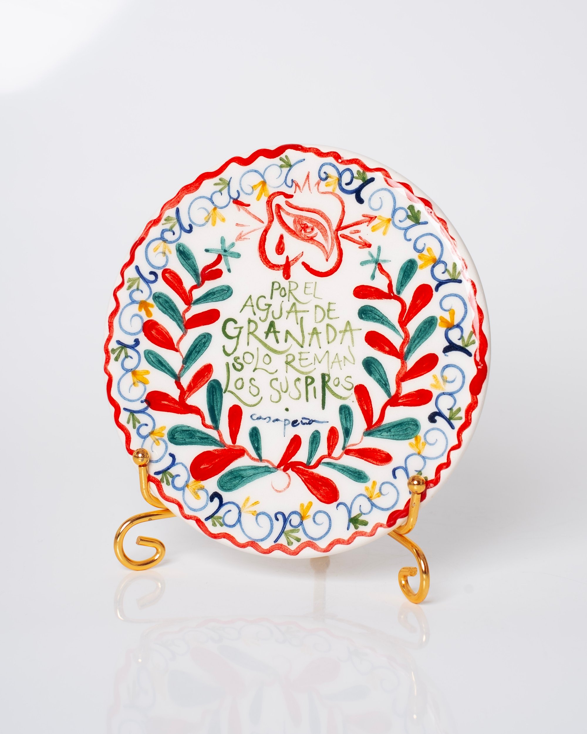 Cada plato puede llevar dos agujeros por detrás. Algunos, por el proceso de esmaltado y horneado, pueden ser taponados. Tanto si es el caso como si no, se recomienda colgar con un soporte abrazadera o colocar sobre un soporte de pie como en la imagen de presentación. Las piezas son esmaltadas sólo por la cara decorada.