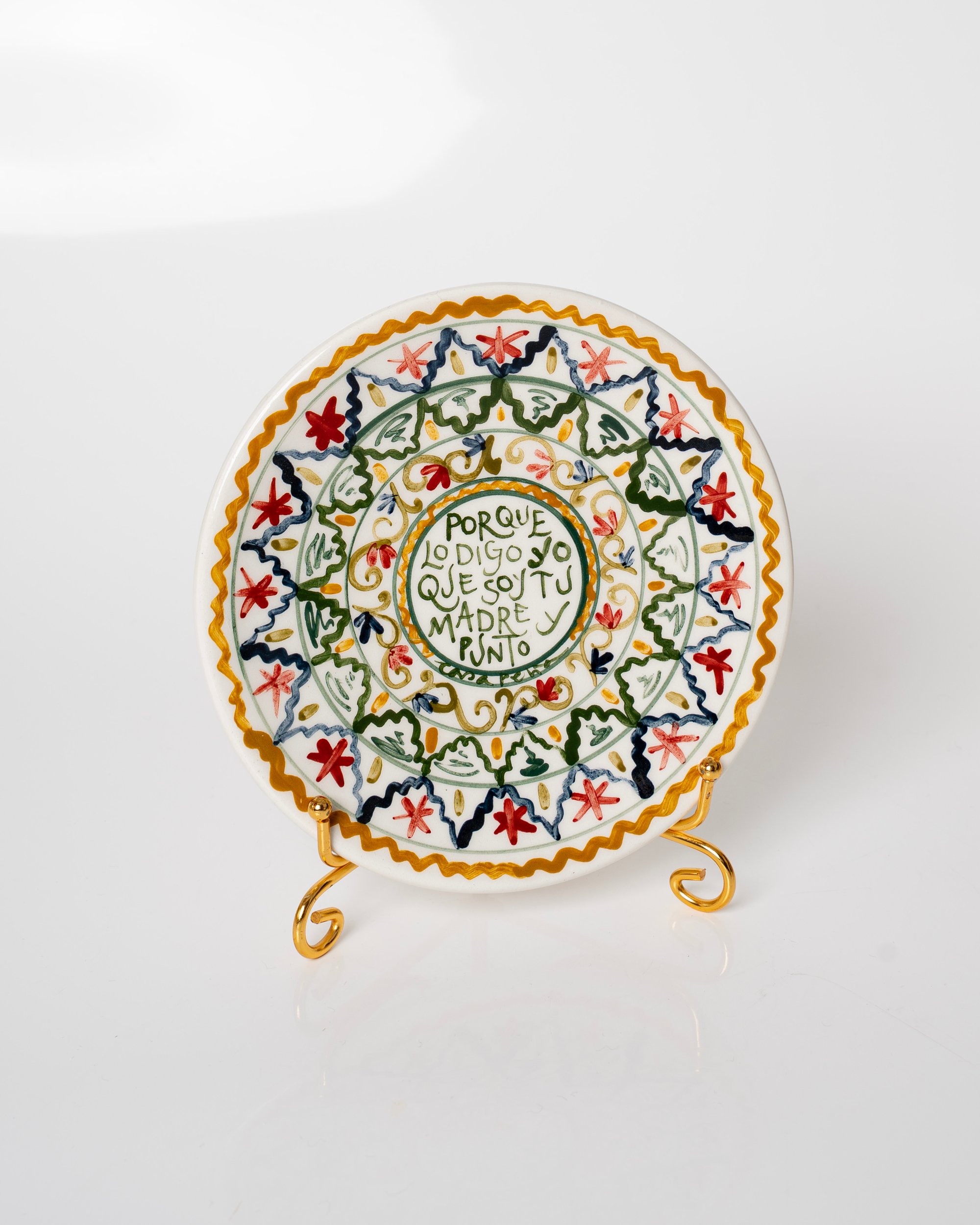 Cada plato puede llevar dos agujeros por detrás. Algunos, por el proceso de esmaltado y horneado, pueden ser taponados. Tanto si es el caso como si no, se recomienda colgar con un soporte abrazadera o colocar sobre un soporte de pie como en la imagen de presentación. Las piezas son esmaltadas sólo por la cara decorada.