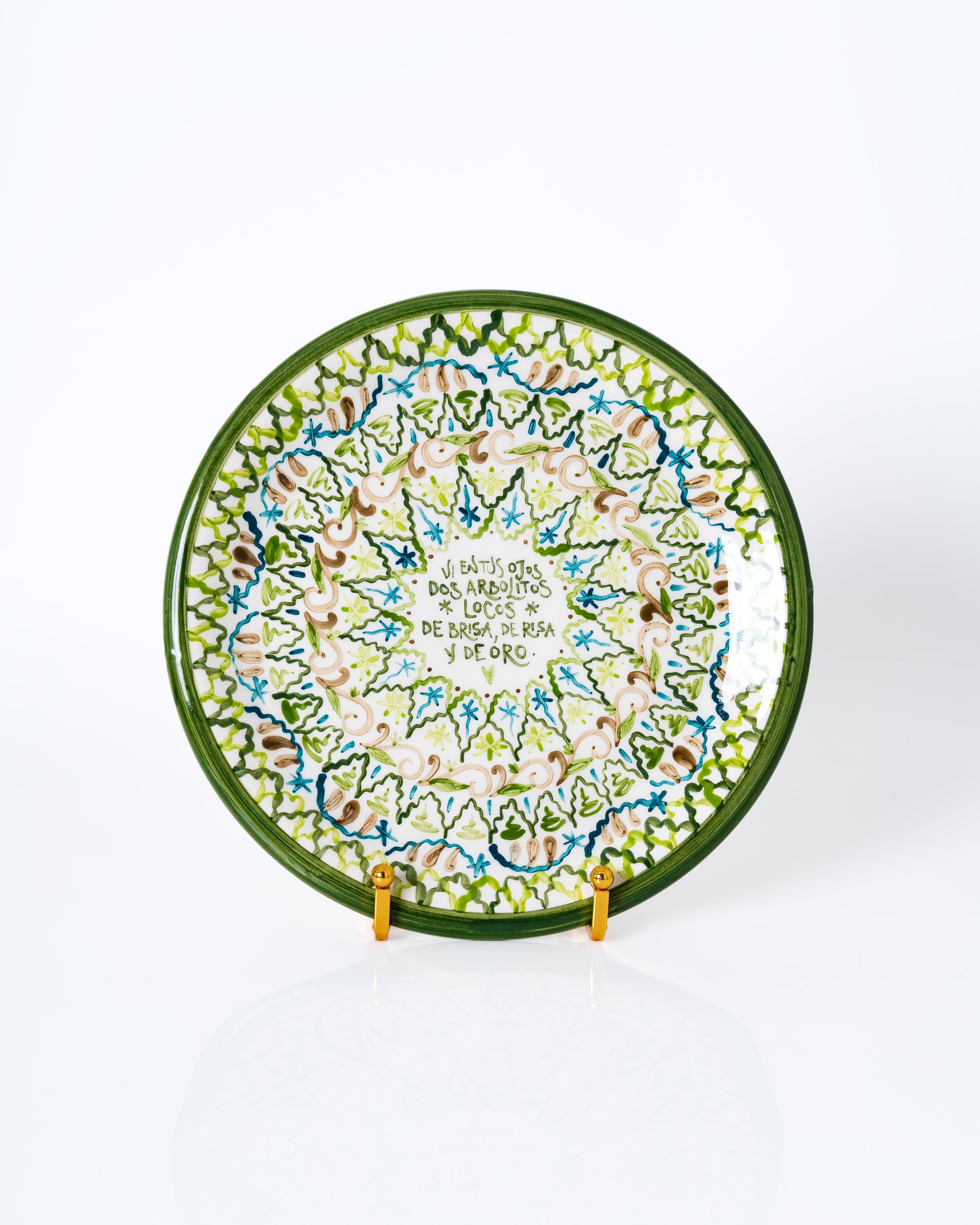 Cada plato puede llevar dos agujeros por detrás. Algunos, por el proceso de esmaltado y horneado, pueden ser taponados. Tanto si es el caso como si no, se recomienda colgar con un soporte abrazadera o colocar sobre un soporte de pie como en la imagen de presentación. Las piezas son esmaltadas sólo por la cara decorada.
